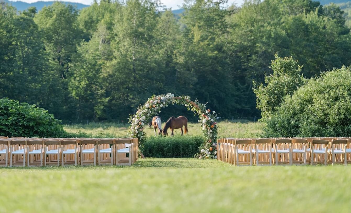 A luxurious seasonal tent with draped ceilings, wooden floors, and sweeping Green Mountain views, perfect for elegant celebrations surrounded by nature.